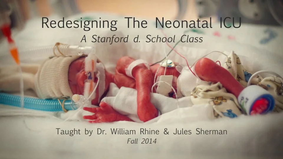 Co-taught with Dr. William Rhine, Head of Neonatology at Lucile Packard Children’s Hospital. The hospital L&D experience became a backdrop for learning design thinking methodology. Our approach was to give students the opportunity to develop empathy for mothers, partners, babies, and clinicians in labor and delivery through observing simulations, synthesizing research, and developing novel products and protocols to improve care.